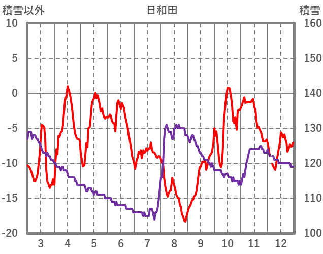 | 日 | 時 | 気温 | 降水 | 風向/風速 | 日照 | 積雪 | 降雪 |
