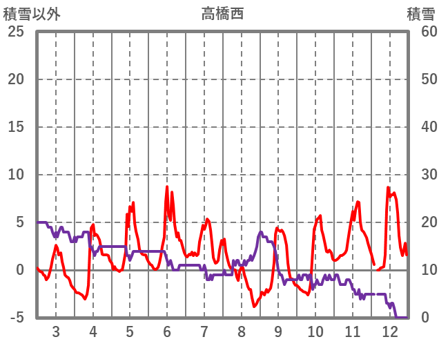| 日 | 時 | 気温 | 降水 | 風向/風速 | 日照 | 積雪 | 降雪 |