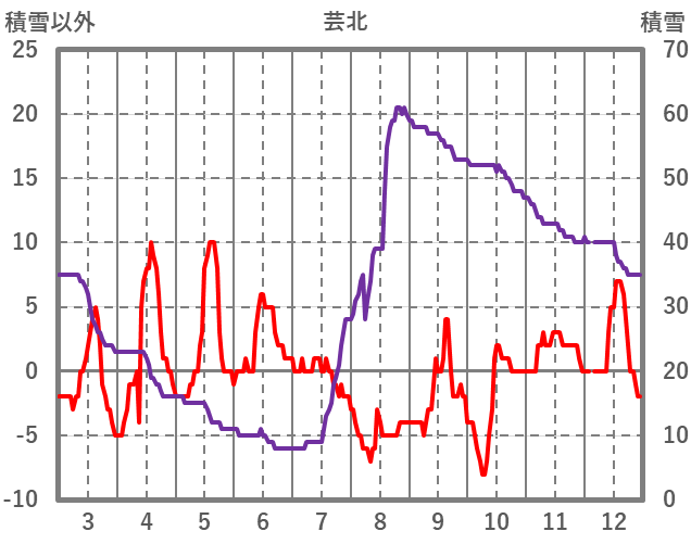 | 日 | 時 | 気温 | 降水 | 風向/風速 | 日照 | 積雪 | 降雪 |