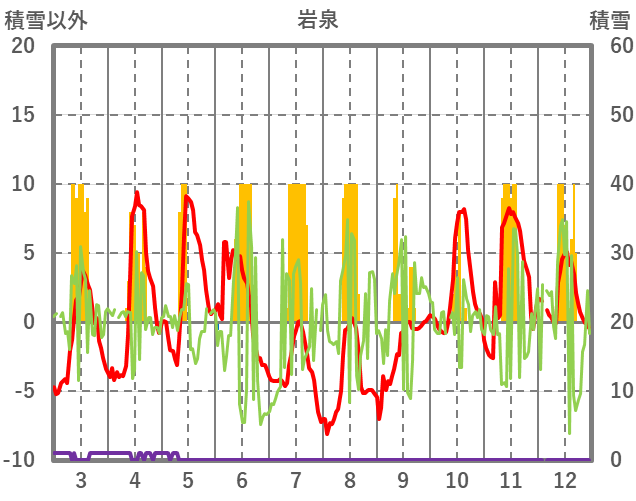 | 日 | 時 | 気温 | 降水 | 風向/風速 | 日照 | 積雪 | 降雪 |