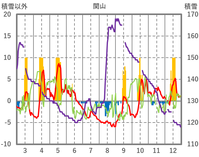| 日 | 時 | 気温 | 降水 | 風向/風速 | 日照 | 積雪 | 降雪 |