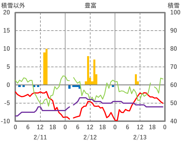 | 日 | 時 | 気温 | 降水 | 風向/風速 | 日照 | 積雪 | 降雪 |