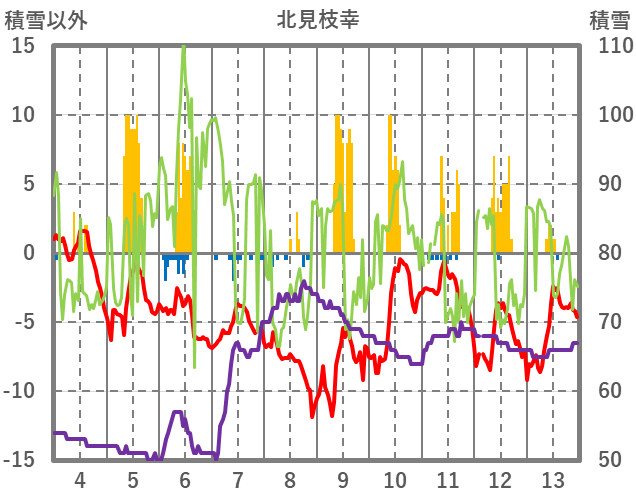 | 日 | 時 | 気温 | 降水 | 風向/風速 | 日照 | 積雪 | 降雪 |