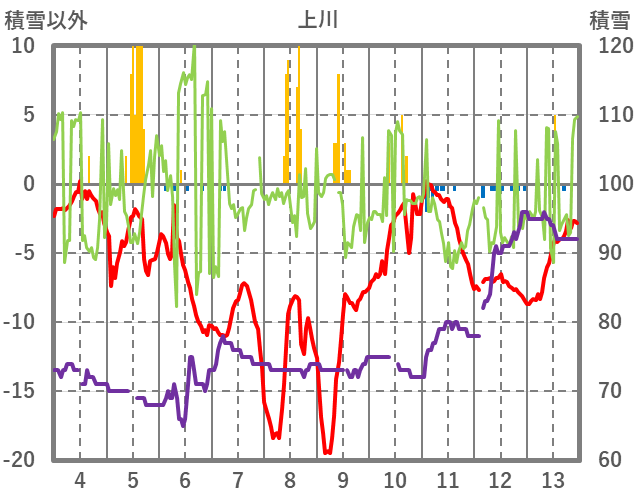 | 日 | 時 | 気温 | 降水 | 風向/風速 | 日照 | 積雪 | 降雪 |