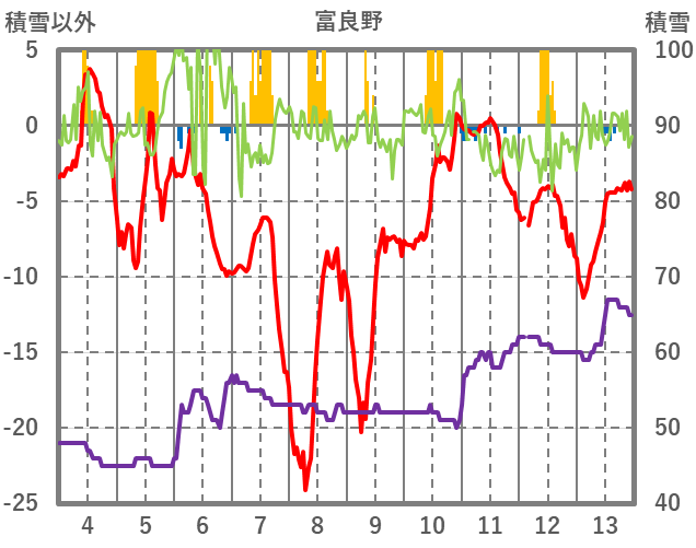 | 日 | 時 | 気温 | 降水 | 風向/風速 | 日照 | 積雪 | 降雪 |