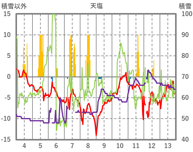 | 日 | 時 | 気温 | 降水 | 風向/風速 | 日照 | 積雪 | 降雪 |