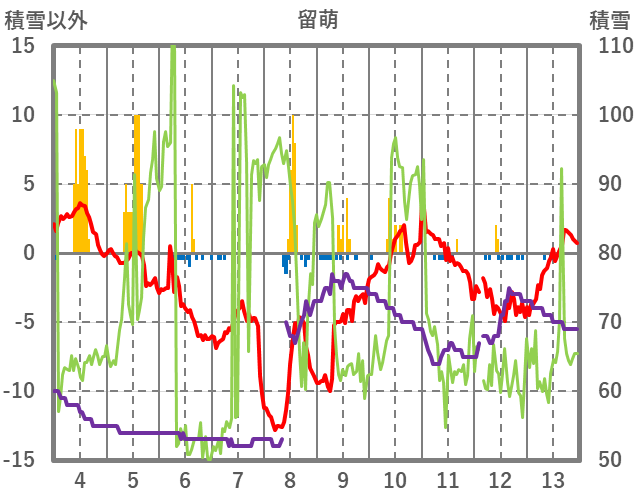 | 日 | 時 | 気温 | 降水 | 風向/風速 | 日照 | 積雪 | 降雪 |