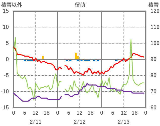 | 日 | 時 | 気温 | 降水 | 風向/風速 | 日照 | 積雪 | 降雪 |