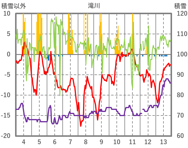 | 日 | 時 | 気温 | 降水 | 風向/風速 | 日照 | 積雪 | 降雪 |