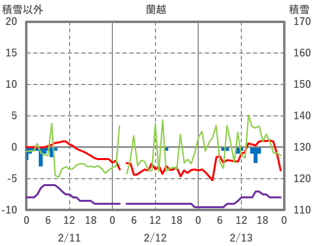 | 日 | 時 | 気温 | 降水 | 風向/風速 | 日照 | 積雪 | 降雪 |