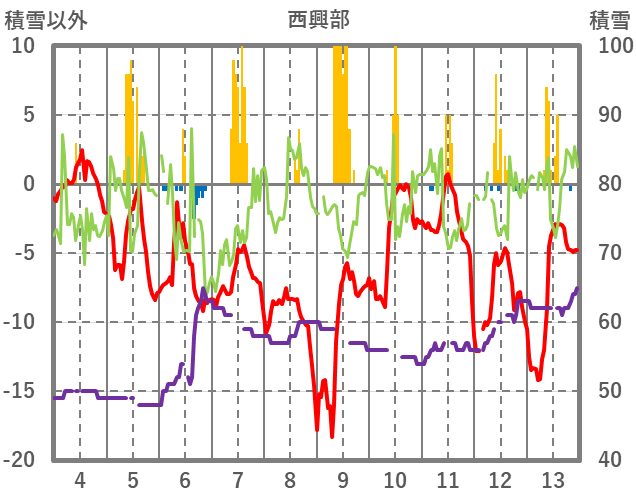 | 日 | 時 | 気温 | 降水 | 風向/風速 | 日照 | 積雪 | 降雪 |