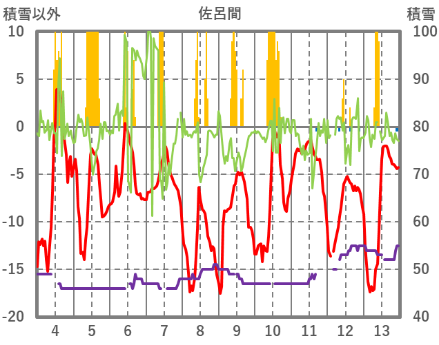 | 日 | 時 | 気温 | 降水 | 風向/風速 | 日照 | 積雪 | 降雪 |
