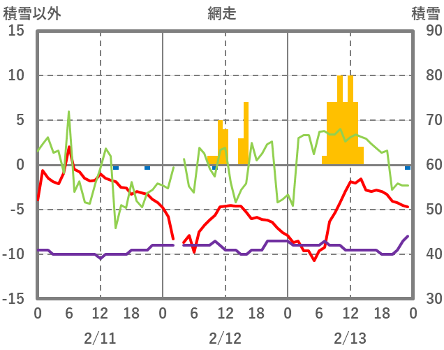 | 日 | 時 | 気温 | 降水 | 風向/風速 | 日照 | 積雪 | 降雪 |