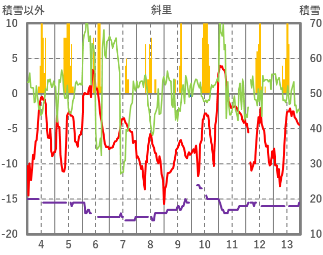 | 日 | 時 | 気温 | 降水 | 風向/風速 | 日照 | 積雪 | 降雪 |