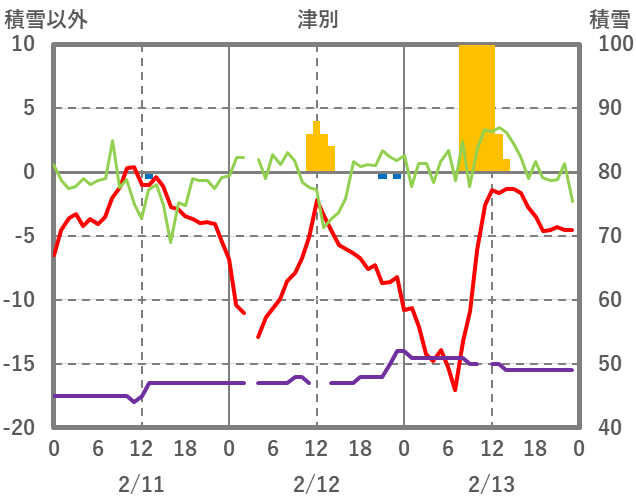 | 日 | 時 | 気温 | 降水 | 風向/風速 | 日照 | 積雪 | 降雪 |
