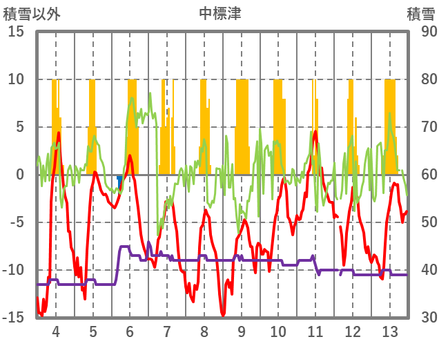 | 日 | 時 | 気温 | 降水 | 風向/風速 | 日照 | 積雪 | 降雪 |