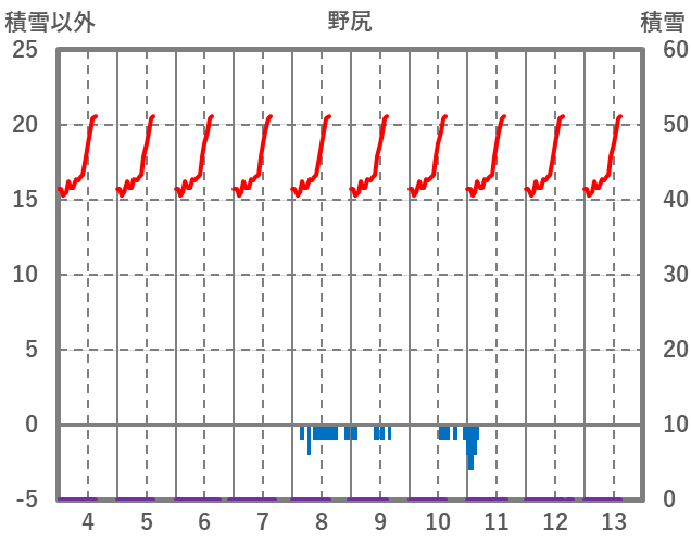 | 日 | 時 | 気温 | 降水 | 風向/風速 | 日照 | 積雪 | 降雪 |
