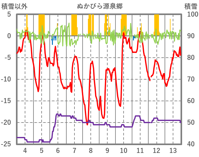 | 日 | 時 | 気温 | 降水 | 風向/風速 | 日照 | 積雪 | 降雪 |