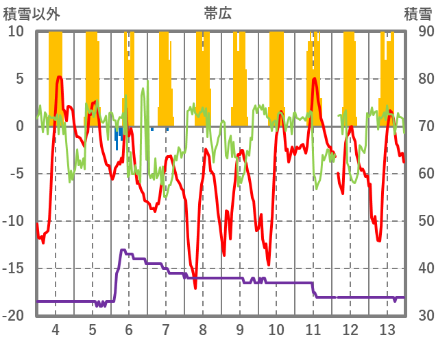 | 日 | 時 | 気温 | 降水 | 風向/風速 | 日照 | 積雪 | 降雪 |