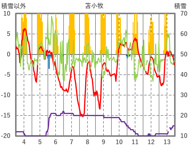 | 日 | 時 | 気温 | 降水 | 風向/風速 | 日照 | 積雪 | 降雪 |