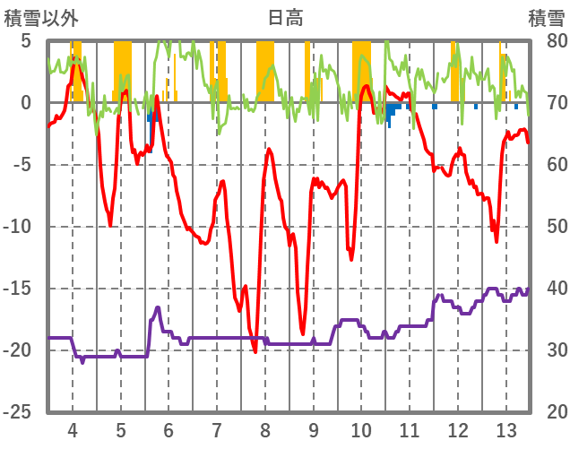 | 日 | 時 | 気温 | 降水 | 風向/風速 | 日照 | 積雪 | 降雪 |
