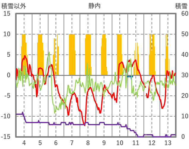 | 日 | 時 | 気温 | 降水 | 風向/風速 | 日照 | 積雪 | 降雪 |