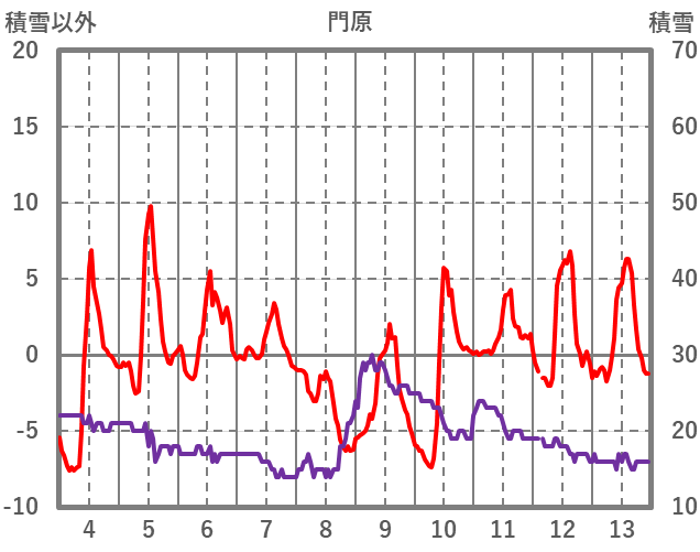 | 日 | 時 | 気温 | 降水 | 風向/風速 | 日照 | 積雪 | 降雪 |