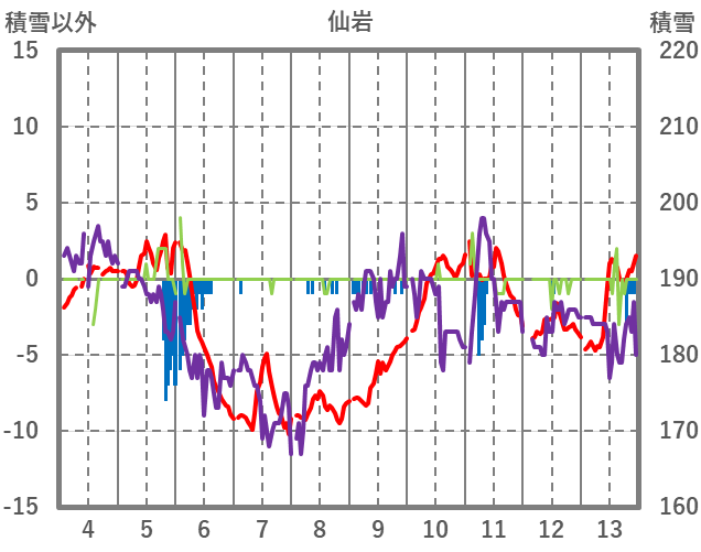 | 日 | 時 | 気温 | 降水 | 風向/風速 | 日照 | 積雪 | 降雪 |