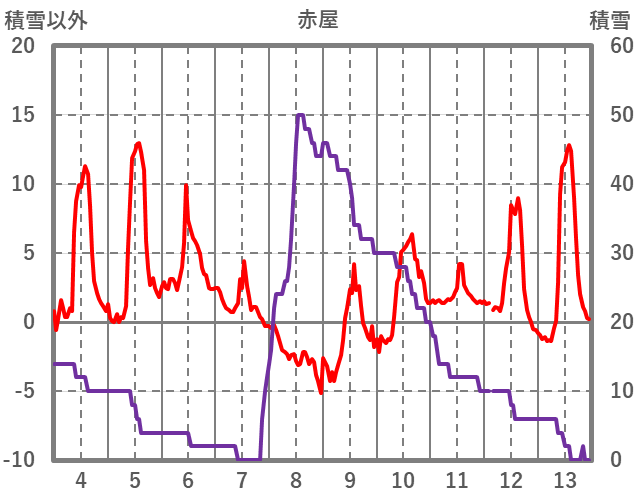 | 日 | 時 | 気温 | 降水 | 風向/風速 | 日照 | 積雪 | 降雪 |