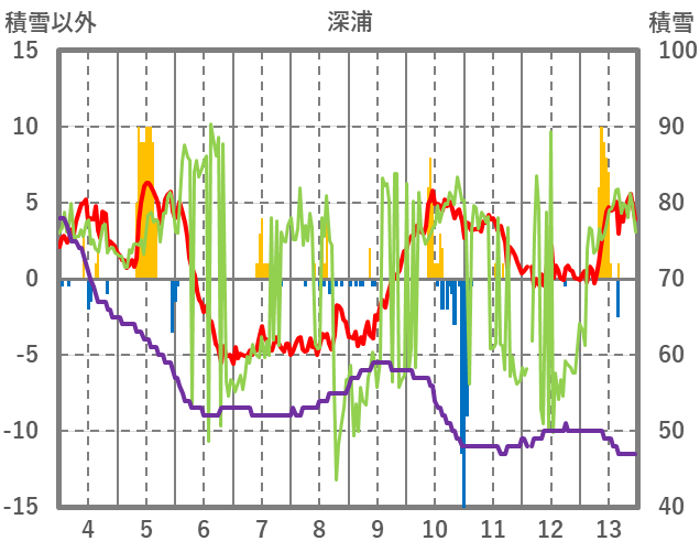 | 日 | 時 | 気温 | 降水 | 風向/風速 | 日照 | 積雪 | 降雪 |