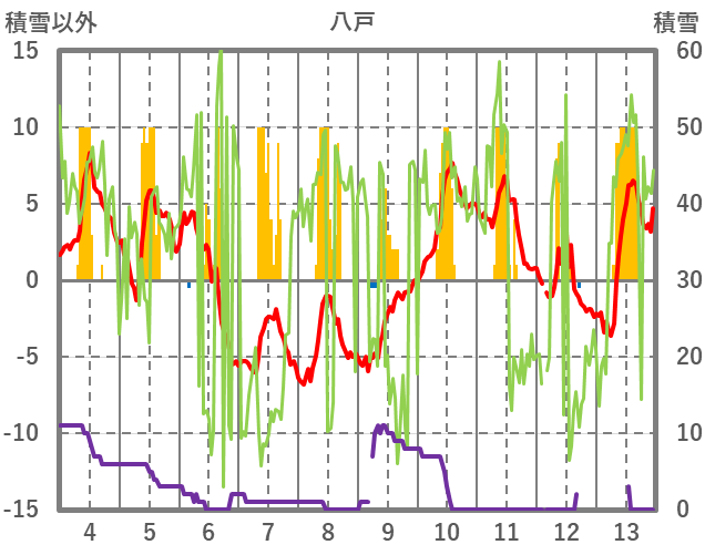 | 日 | 時 | 気温 | 降水 | 風向/風速 | 日照 | 積雪 | 降雪 |
