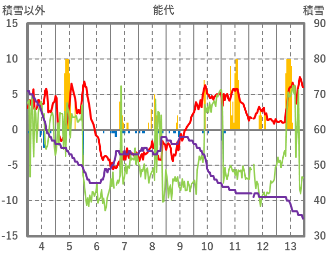 | 日 | 時 | 気温 | 降水 | 風向/風速 | 日照 | 積雪 | 降雪 |