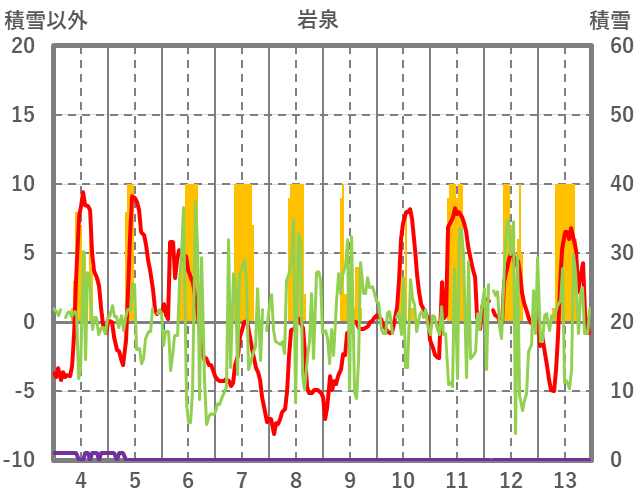 | 日 | 時 | 気温 | 降水 | 風向/風速 | 日照 | 積雪 | 降雪 |
