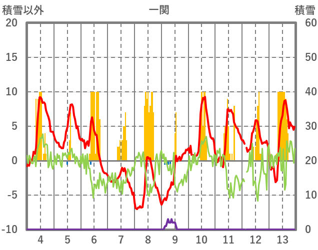 | 日 | 時 | 気温 | 降水 | 風向/風速 | 日照 | 積雪 | 降雪 |