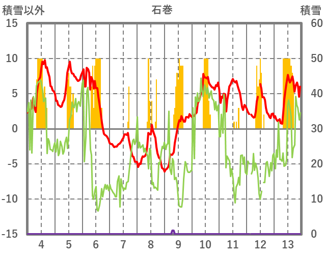 | 日 | 時 | 気温 | 降水 | 風向/風速 | 日照 | 積雪 | 降雪 |