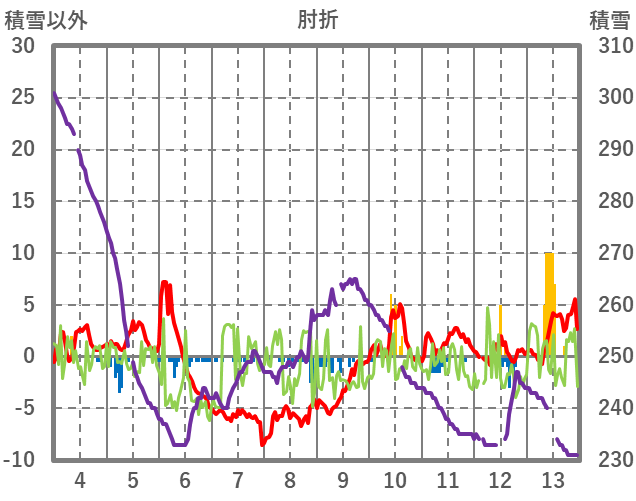| 日 | 時 | 気温 | 降水 | 風向/風速 | 日照 | 積雪 | 降雪 |
