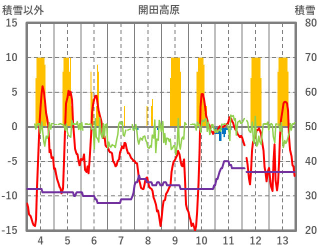 | 日 | 時 | 気温 | 降水 | 風向/風速 | 日照 | 積雪 | 降雪 |