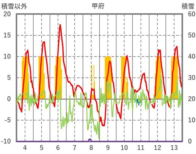 | 日 | 時 | 気温 | 降水 | 風向/風速 | 日照 | 積雪 | 降雪 |