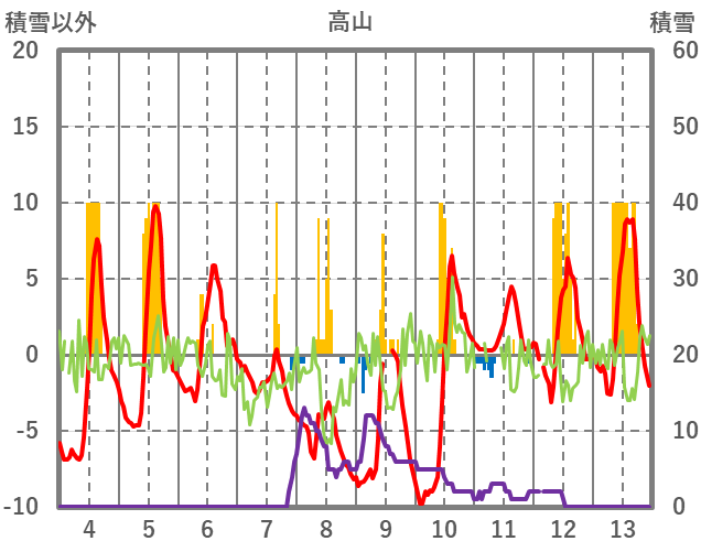 | 日 | 時 | 気温 | 降水 | 風向/風速 | 日照 | 積雪 | 降雪 |