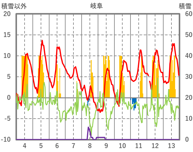 | 日 | 時 | 気温 | 降水 | 風向/風速 | 日照 | 積雪 | 降雪 |