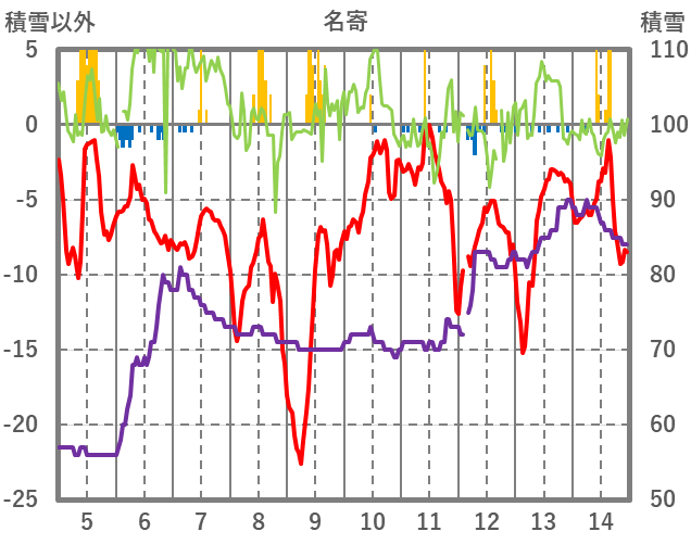 | 日 | 時 | 気温 | 降水 | 風向/風速 | 日照 | 積雪 | 降雪 |