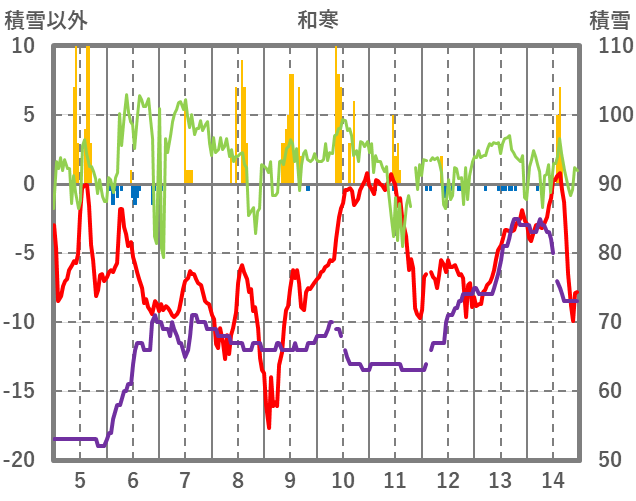 | 日 | 時 | 気温 | 降水 | 風向/風速 | 日照 | 積雪 | 降雪 |