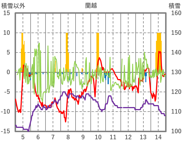 | 日 | 時 | 気温 | 降水 | 風向/風速 | 日照 | 積雪 | 降雪 |