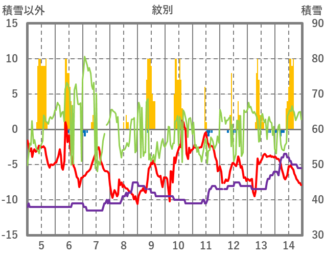 | 日 | 時 | 気温 | 降水 | 風向/風速 | 日照 | 積雪 | 降雪 |