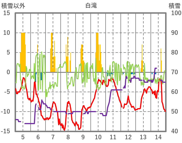 | 日 | 時 | 気温 | 降水 | 風向/風速 | 日照 | 積雪 | 降雪 |