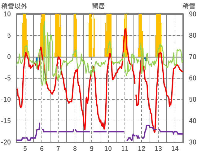 | 日 | 時 | 気温 | 降水 | 風向/風速 | 日照 | 積雪 | 降雪 |