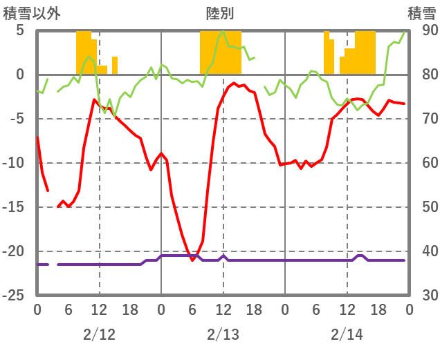 | 日 | 時 | 気温 | 降水 | 風向/風速 | 日照 | 積雪 | 降雪 |