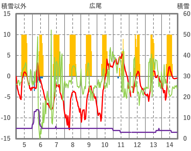 | 日 | 時 | 気温 | 降水 | 風向/風速 | 日照 | 積雪 | 降雪 |