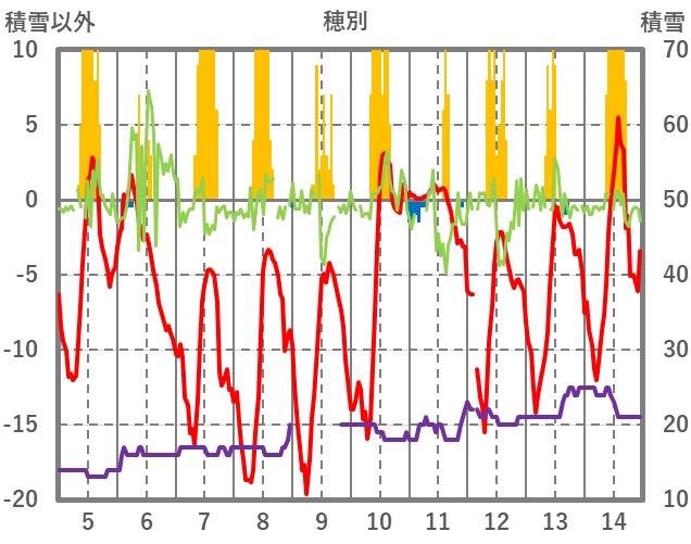 | 日 | 時 | 気温 | 降水 | 風向/風速 | 日照 | 積雪 | 降雪 |