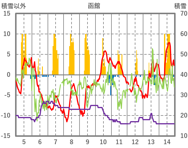 | 日 | 時 | 気温 | 降水 | 風向/風速 | 日照 | 積雪 | 降雪 |